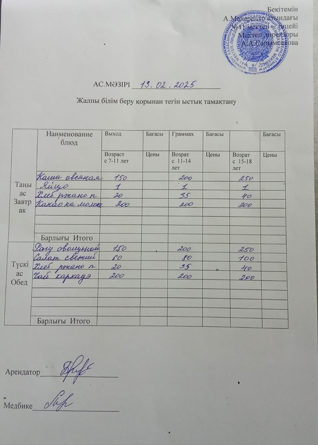» 2025 жылдың 13 ақпандағы ас мәзірі