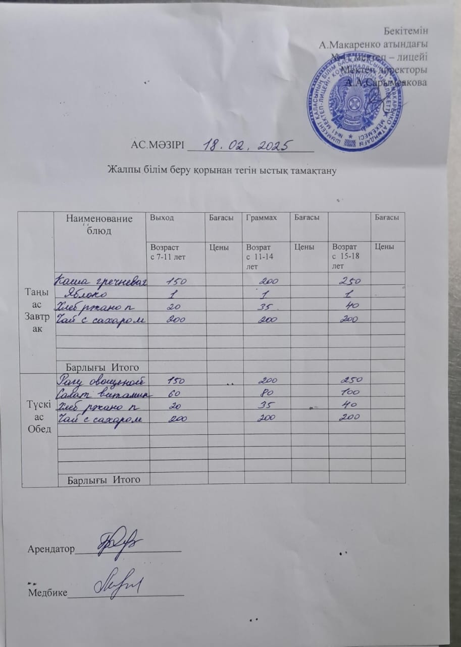 » 2025 жылдың 18 ақпандағы ас мәзірі