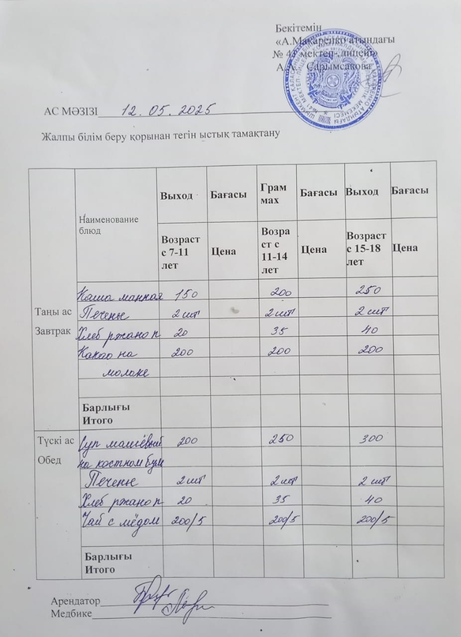 » 2025 жылдың 12 мамырдың ас мәзірі