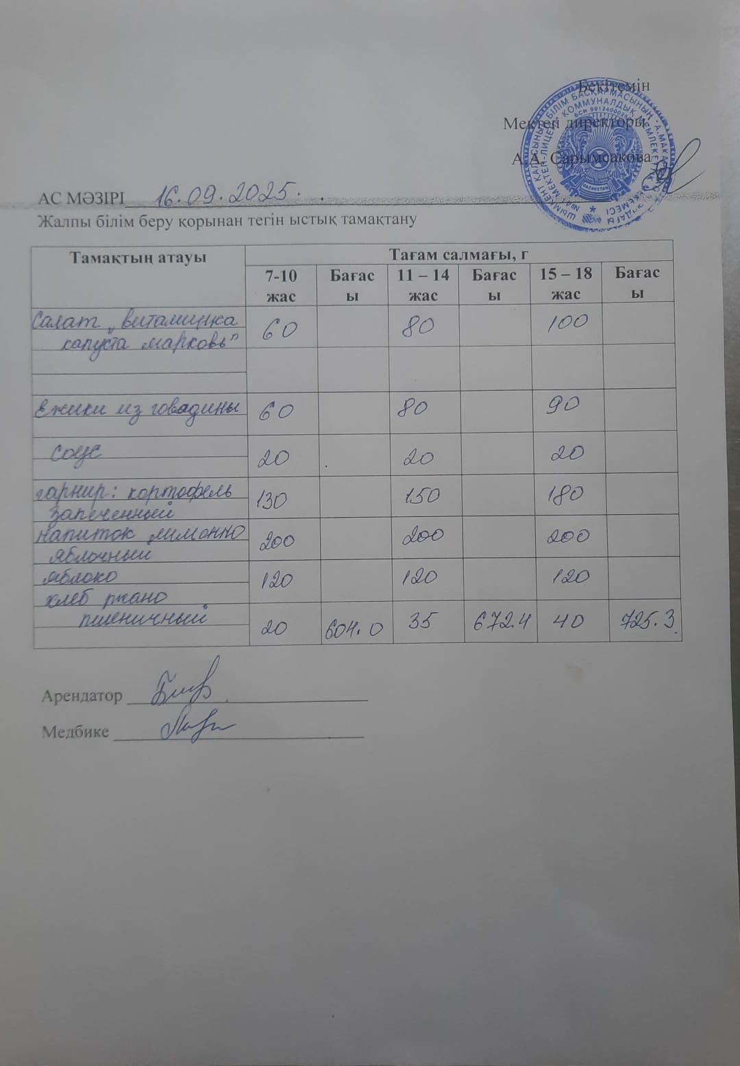 » 2025 жылғы 16 қыркүйектің ас мәзірі