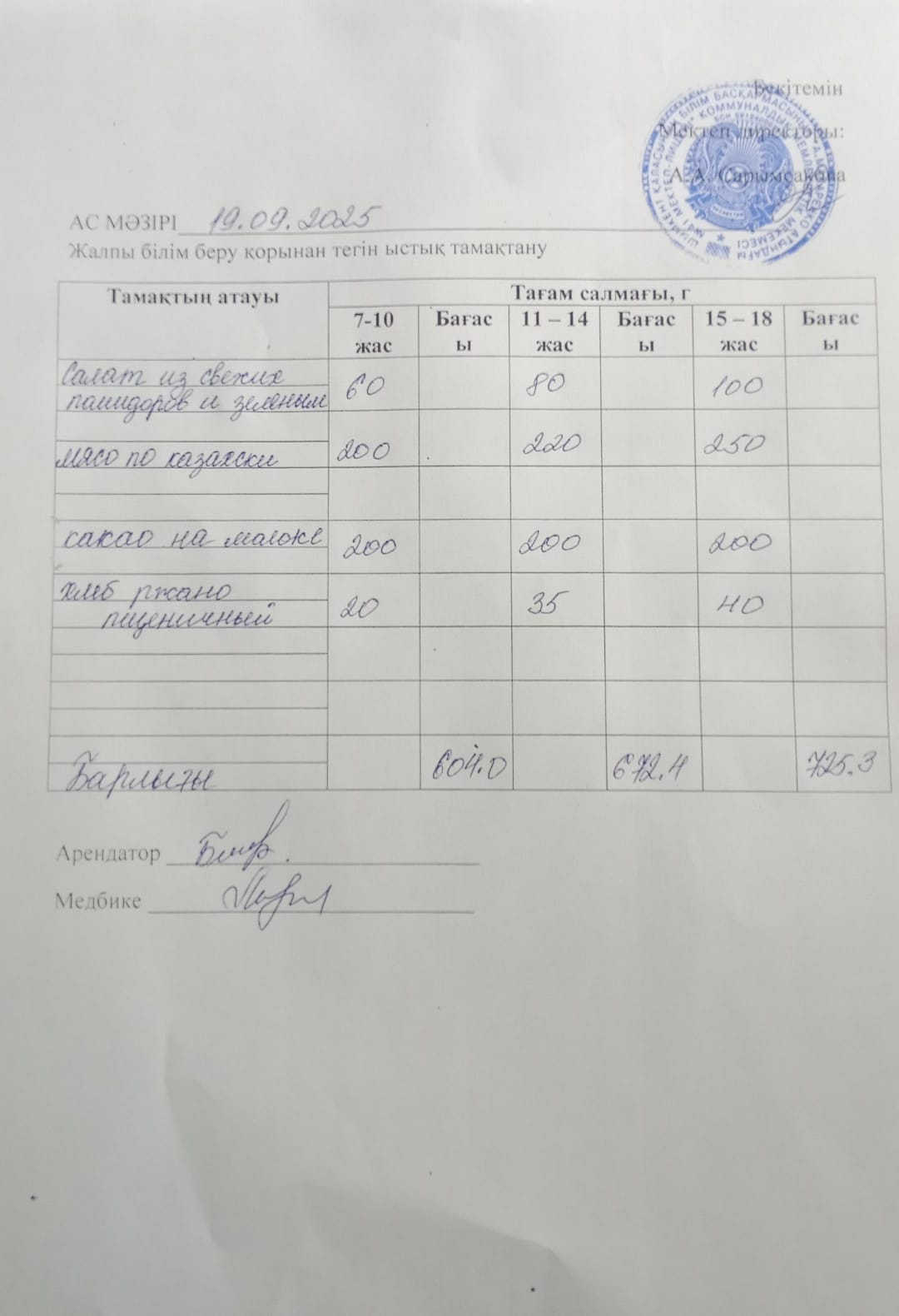 » 2025 жылғы 19 қыркүйектің ас мәзірі