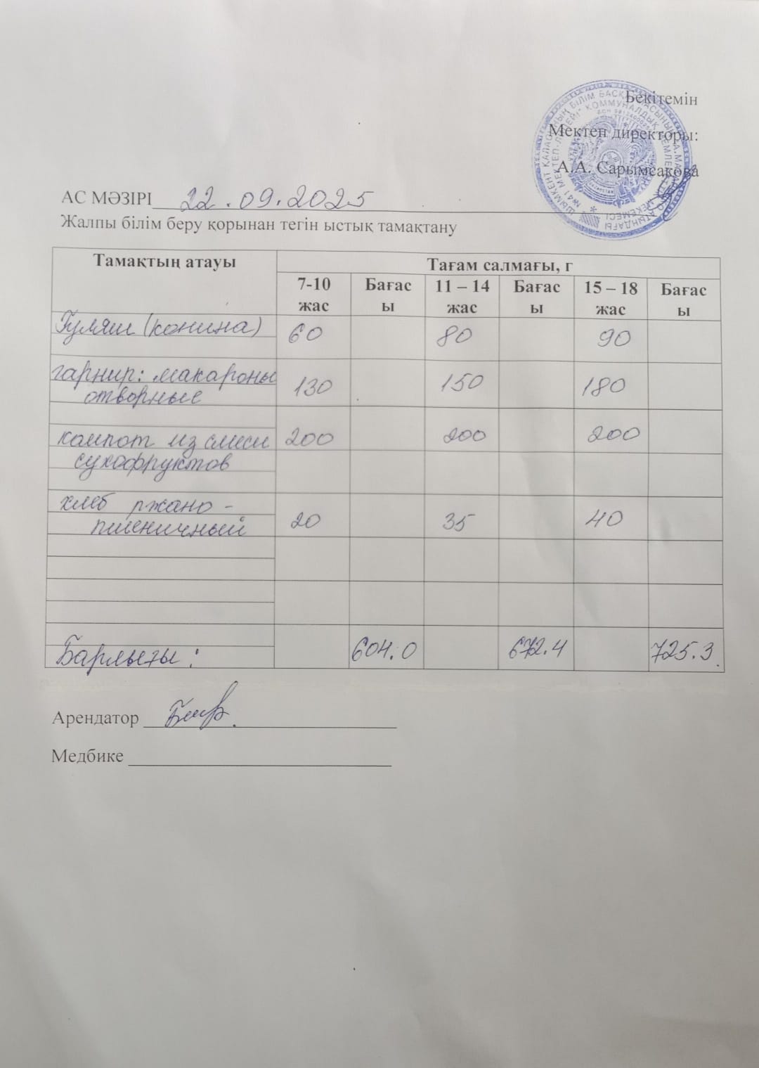 » 2025 жылғы 22қыркүйектің ас мәзірі