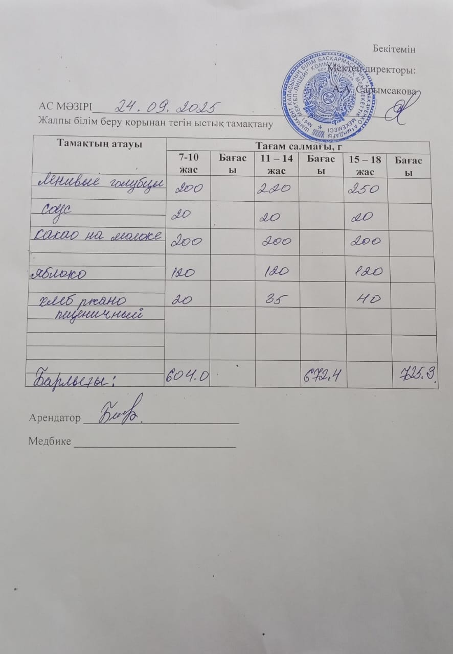 » 2025 жылғы 24 қыркүйектің ас мәзірі