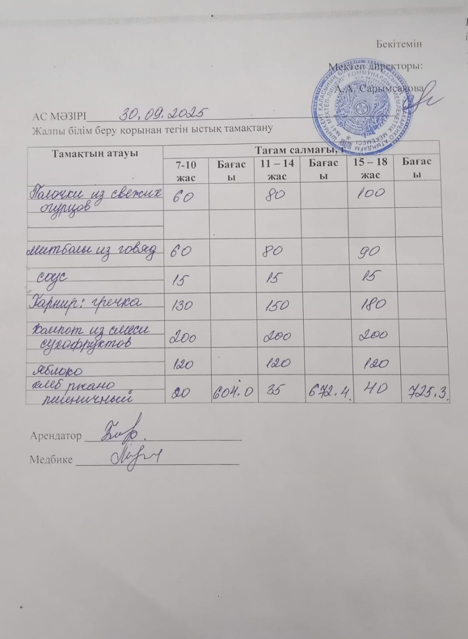» 2025 жылғы 30 қыркүйектің ас мәзірі