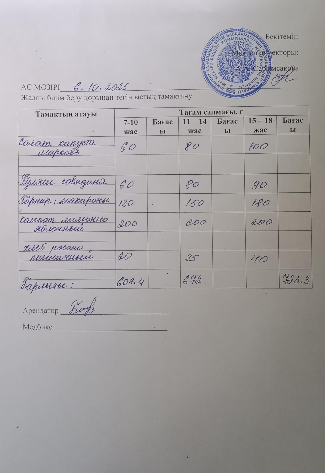 » 2025 жылғы 06 қазандағы ас мәзірі