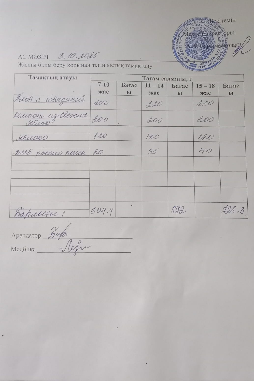» 2025 жылдың 03 қазандағы ас мәзірі