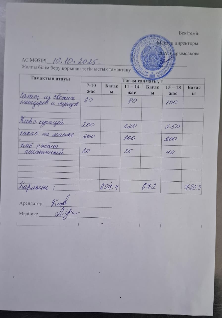 » 2025 жылдың 10 қазандағы ас мәзірі