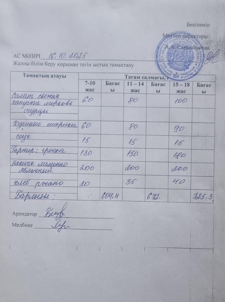 » 2025 жылдың 16 қазанындағы ас мәзірі
