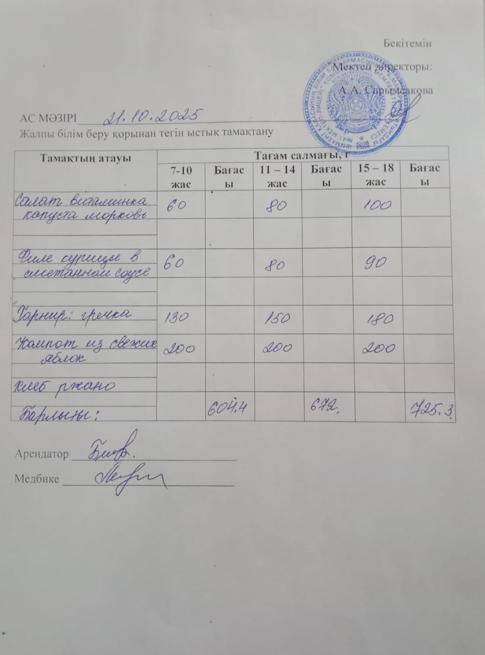 » 2025 жылдың 21 қазанның ас мәзірі