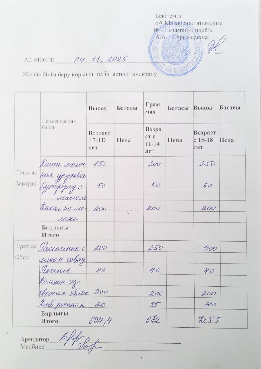 » 2025 жылдың 04 қарашадағы ас мәзірі