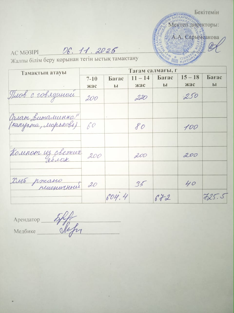 » 2025 жылдың 06 қарашадағы ас мәзірі