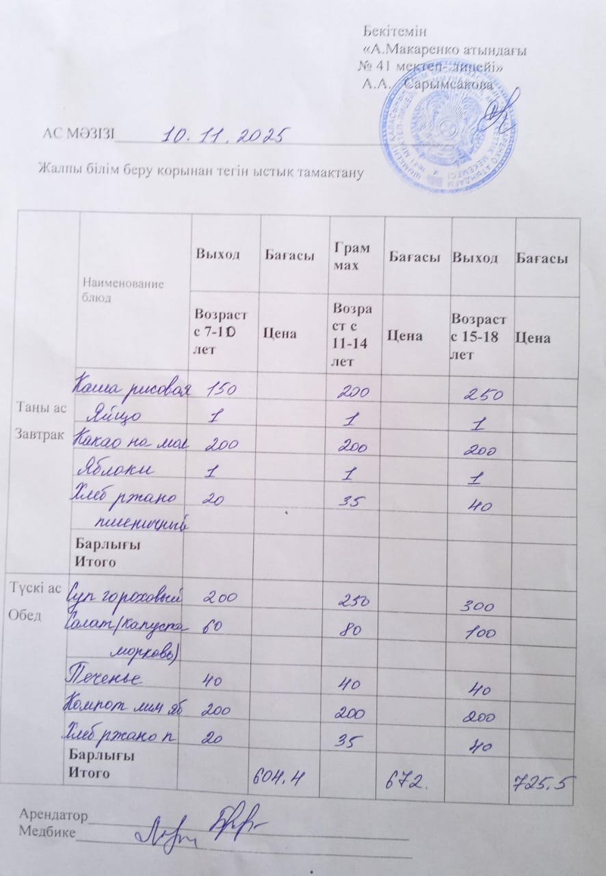 » 2025 жылдың 10 қарашадағы ас мәзірі