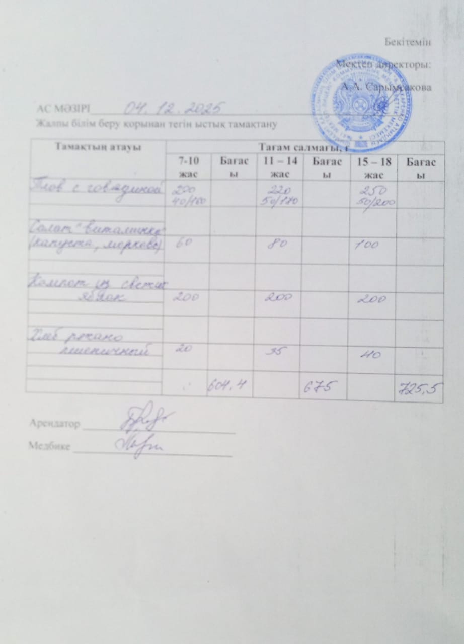 » 2025 жылдың 04 желтоқсандағы ас мәзірі