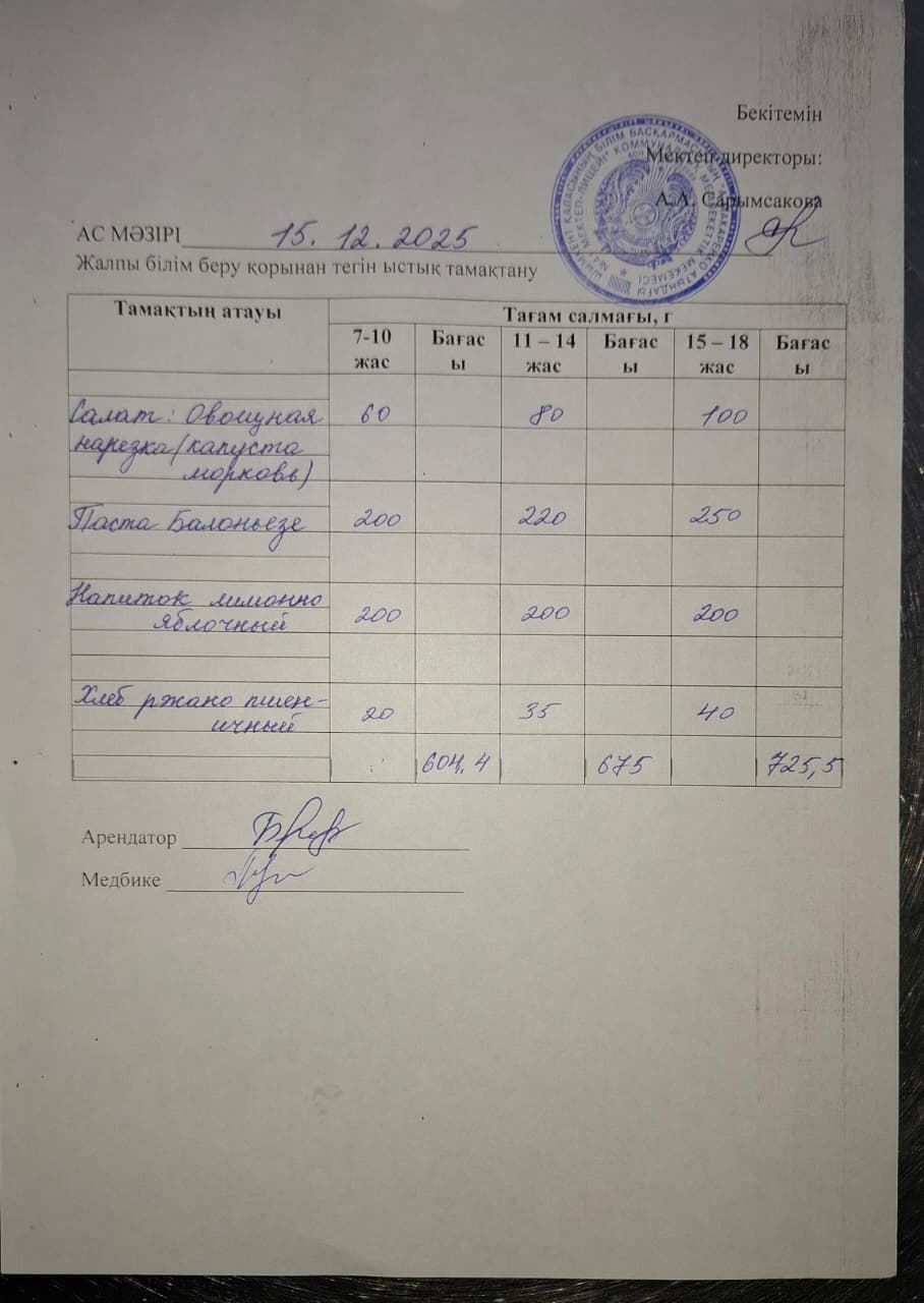 » 2025 жылдың 15 желтоқсандағы ас мәзірі