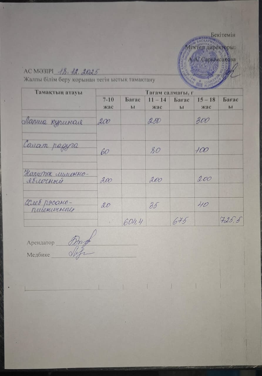 » 2025 жылдың 18 желтоқсандағы ас мәзірі