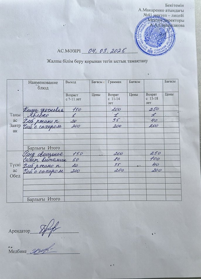 2025 жылғы 29 қыркүйектің ас мәзірі